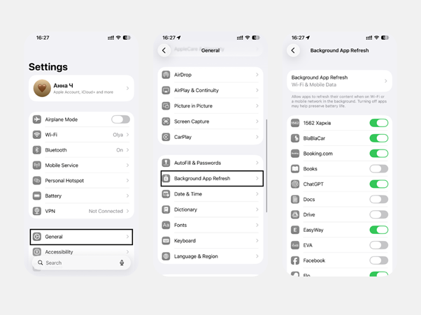 Орналасқан жер деректерін жаңартуды iOS өзі басқарады: жүйе қажетті деректерді фондық режимде жаңартып отырады. Қай қолданбалар мұндай жаңартуларды алатынын «Контентті жаңарту» бөлімінде реттеуге болады.