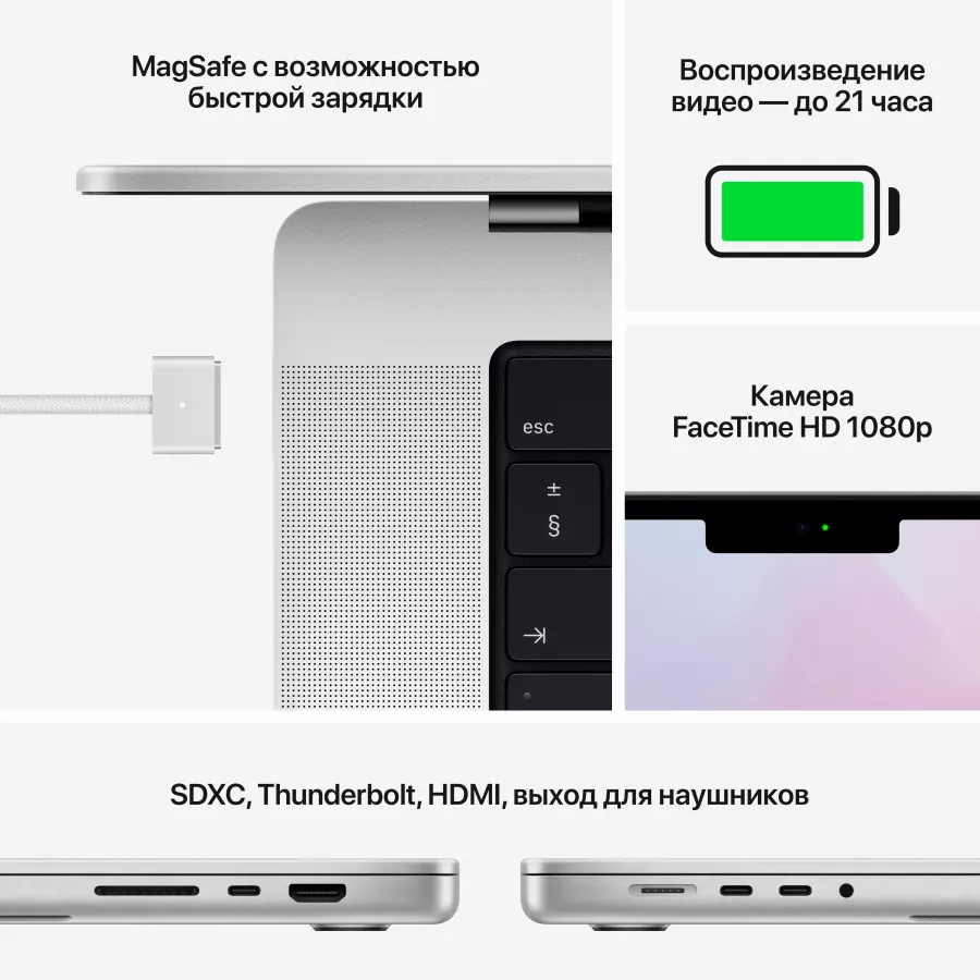 - Три порта Thunderbolt 4, HDMI, слот для карт SDXC, разъём для наушников, порт MagSafe 3